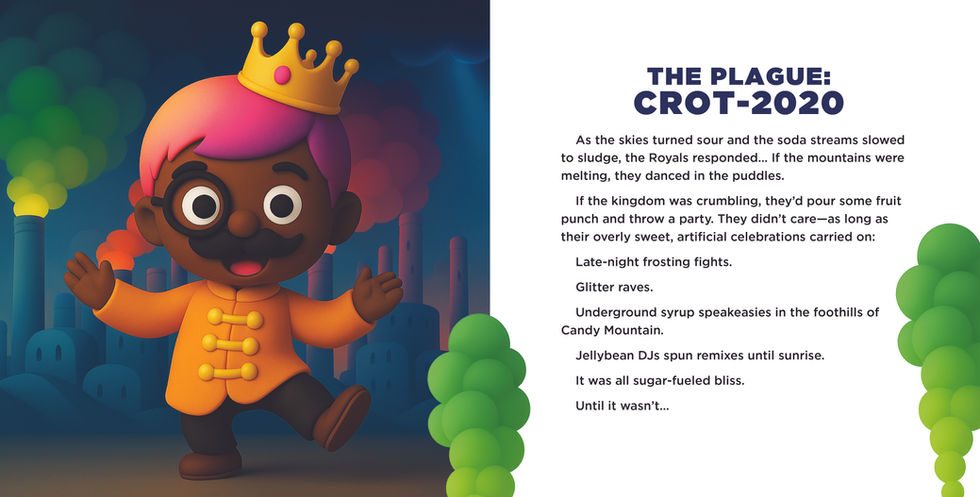 A sugar-coated takedown of corruption, greed, and denial—disguised as a children’s book. In The Rise and Rot of Rancid Royalty, candy becomes currency, artificial sweeteners spell environmental collapse, and sprinkle-obsessed Royals rule a kingdom crumbling from the inside out. As the frosting melts, King Orangello the Overripe flees to Mar-a-Mango Manor in a swirl of licorice lies—leaving a rising rebellion in his sticky wake.